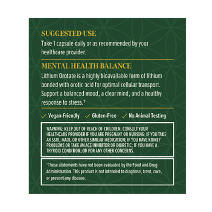 Global Healing Lithium Orotate supplement combines lithium with orotic acid to promote a joyful mood, a resilient stress response, and optimal cognitive function. Each vegetarian capsule delivers 10 mg of elemental lithium.